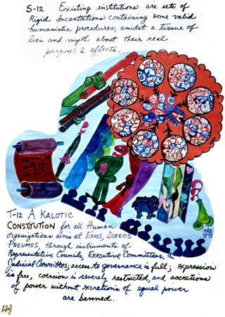 A kalotic constitution for all human organizations aims at emos, dikeos, pneumos, through instruments of representative councils, executive committees, and judicial committees; access to governance is full, expression free, coercion restricted, accretions of power without excretions of equal power banned. |
