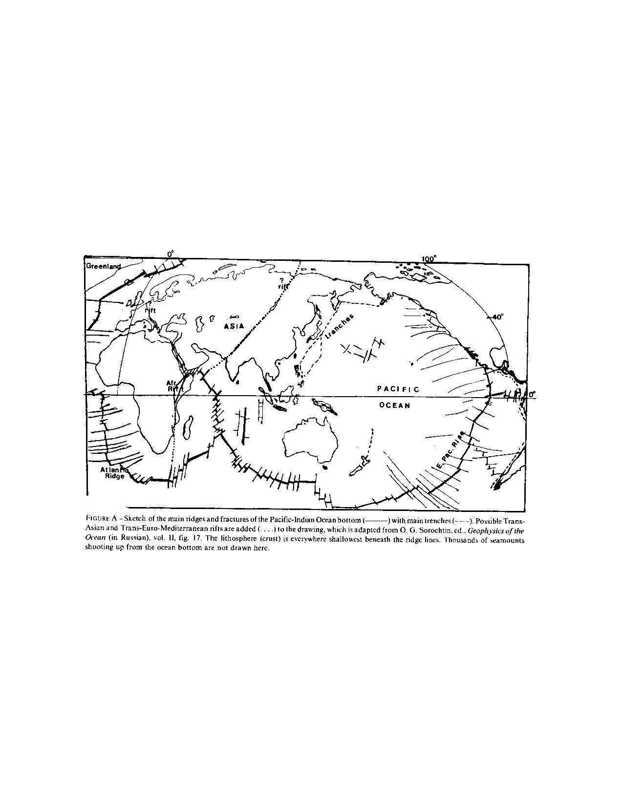Sketch of the main ridges and fractures of the Pacific Indian ocean bottom with main trenches. Possible