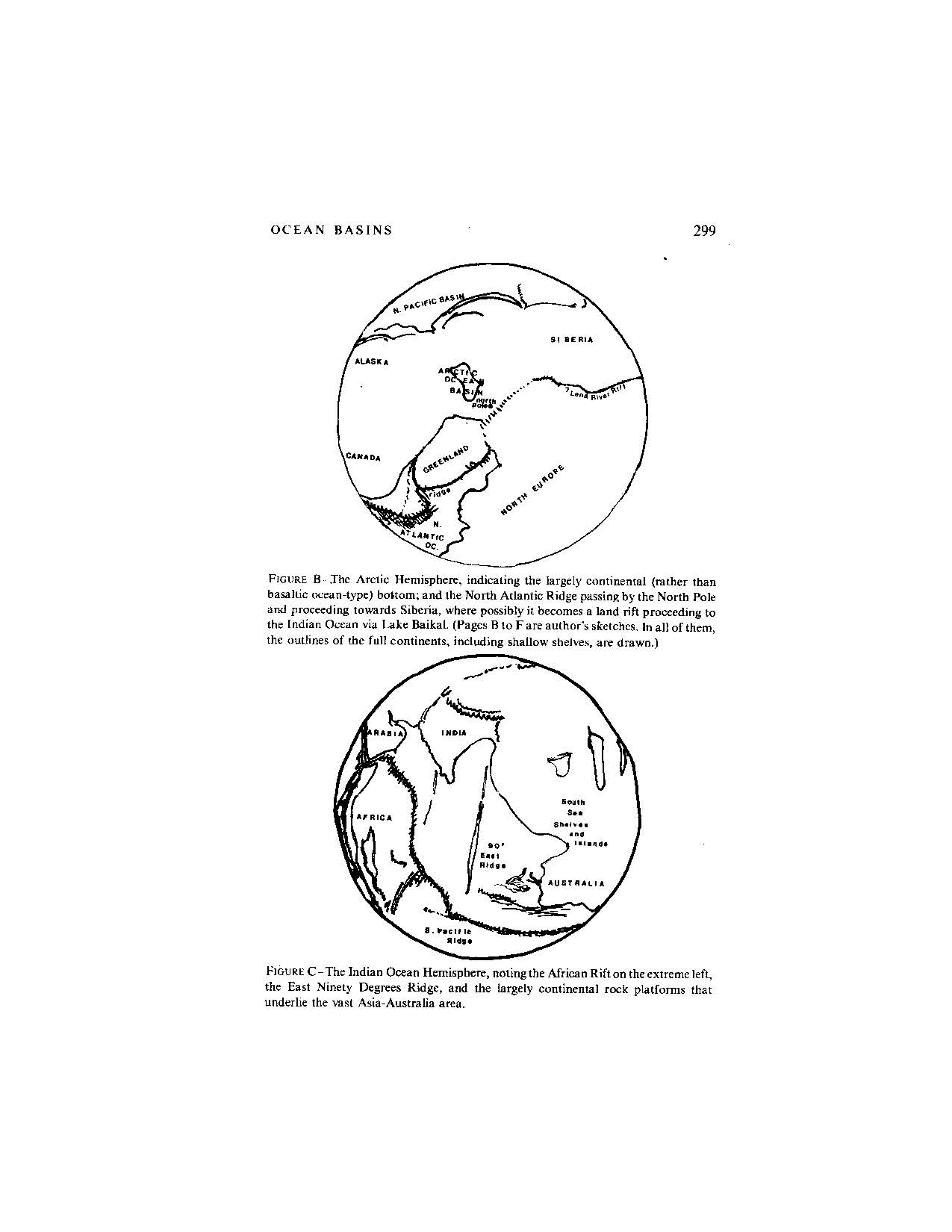 The Arctic Ocean scarcely deserves the name [5] . The North Pole area is flatter than the lands to the south and some miles lower than the swollen equatorial belt. If it were not so, there would be no Arctic Ocean. By far the greatest pan of the Arctic Ocean floor is continental shelf, less than 300 meters below sea level. There are half a dozen abyssal plains with depths from 2700 meters to 5000 meters. The Mid-Atlantic ridge forks northwards around Greenland and the two prongs come close together north of Greenland, then move in parallel across the ocean bed sandwiching the North Pole abyssal plain between them. A third "Alpha Cordillera" meanders northwest from the North Greenland regroupment, with many seamounts. The three ridges enter the continental shelf of northeast Siberia. They seem to disappear. But the Nansen Cordillera moves into the continental shelf in a great "Sadko Trough" and, precisely in line with it, some 400 km on, there begins the delta of the Lena River and a great valley, probably a rift valley. This rift cuts down through Asia ultimately to join the Indian Ocean ridges.