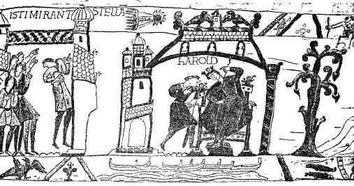 The Bayeaux Tapestry on the Comet of 1066. On the eve of The Battle of Hasting, a comet lit up the sky. The crowds gaze up in awe at the comet, and a courtier tells King Harold of this terrible omen. Below are seen the ghostly invasion ships which Harold now fears will follow. The tapestry was produced only decades after the event.