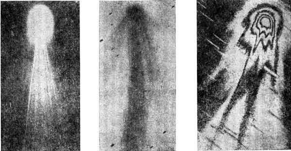 Comets, and to a lesser extent meteoroids, can take many shapes. Several illustrations are given on the adjoining page from astronomical drawing and photographs. Many basic human objects and experiences can be obviously symbolized by a comet: violence, instruments such as swords, chariots, boats, wings, birds, cows, sexual organs, heads, hands, flowers, etc. These apparitions are so suggestive, compelling, and terrorizing that whatever on Earth is associated with them will never again be ordinary, and the ways in which these objects and experiences enter culture will be pathologically or at least illogically affected (see Figure 4 on pp. 26-27).
