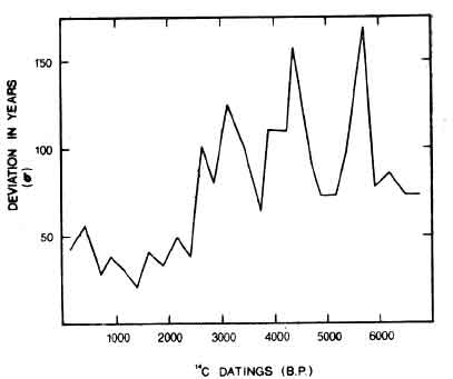 The left-hand scale (s) registers the standard deviation of the "true" curve from the trend curve -- the number of years by which the radio carbon dates of each 250 year period deviate from the average of the whole group of dates of that period. The bottom scale represents the years before the present (taken as 1950 A. D.). As the chart shows, the dates begin to be erratic increasingly around the time of the Martian encounters (-2687 B. P. by this book's 2000 B. P. standard). The time scale goes to -6750, and thus carries one through the Martian, Venusian, Mercurian, and Jovean ages. However, even the erratic swings shown here do not portray the true extent of atmosphere and ecological disturbance, because, as the text asserts, a succession of quick changes in the atmosphere is possible, from low to high radiocarbon intake therefore by the biosphere, and this phenomenon would cause an evening-out of still a second and possibly much more serious form of deviation. Within a time of several years, an organism could ingest widely varying amounts of 14 C. Hence I suggest that radiocarbon dating may be useless before about 2500 years ago and there may have been a completely different radiocarbon cycle, as M. Cook maintains, before the Lunarian catastrophes.