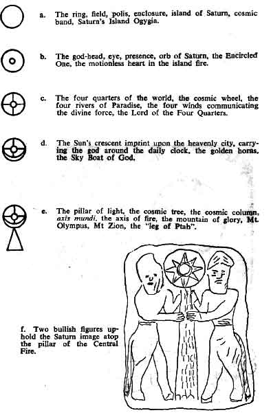 Figure 25f is taken directly from an Assyrian plaque [4] . It illustrates the full form, containing several of the elements "a" to "e", that represents a real-life imitation of Saturn, the god of the second and dominating sun in the period following the emplacement of the Moon and creation of the oceans. Two half-human, half-bullish figures uphold the Saturn image.