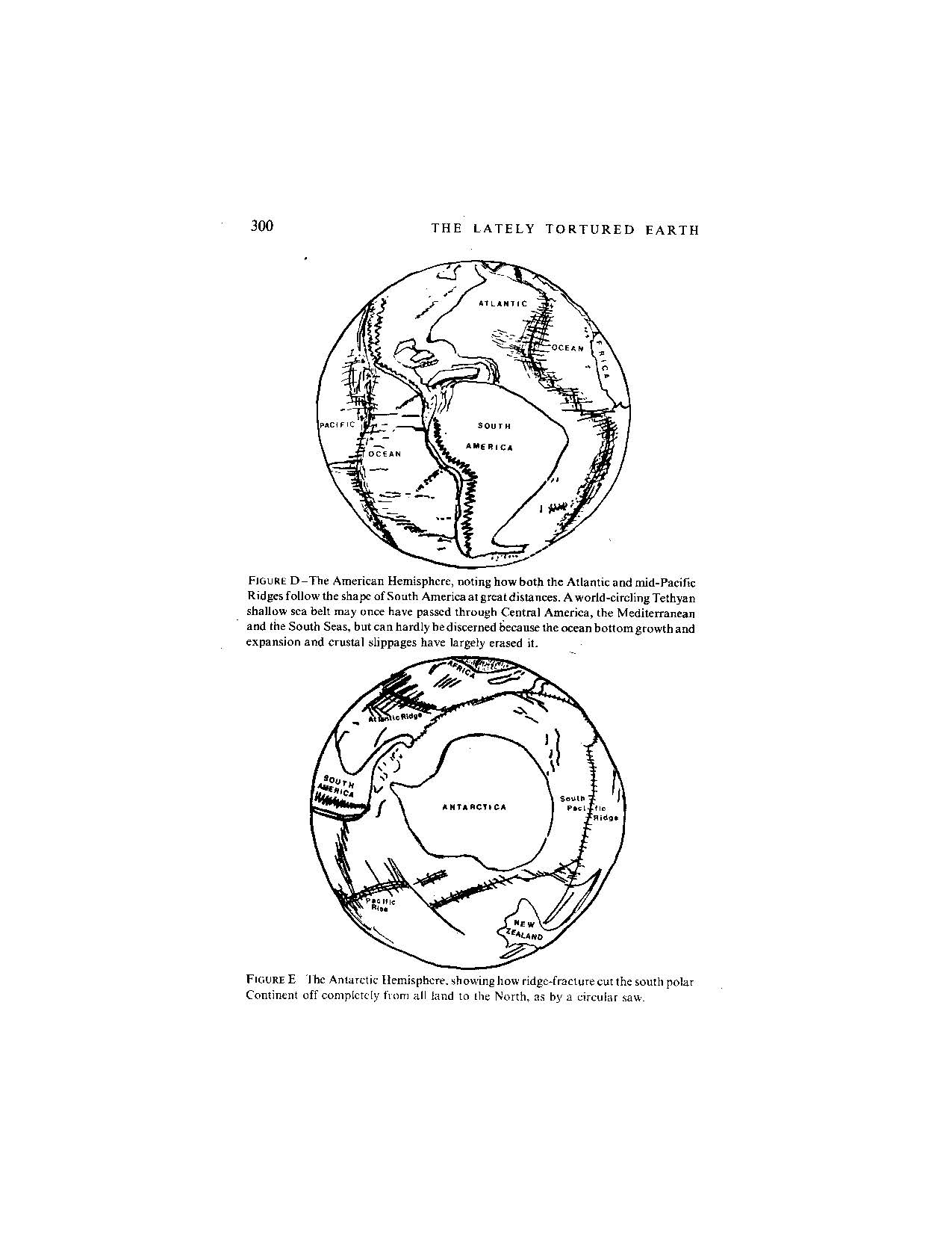 FIGURE E (Click on the picture to get an enlarged view. Caution: Image files are large.): The Antarctic Hemisphere, showing how ridge-fracture cut the south polar Continent off completely from all land to the North, as by a circular saw. It would appear that the main fractures occurred before the main continental shift, (as in the Arctic Basin to the South), because there still is a semblance of order to their progression around Greenland and into Asia. Furthermore, Greenland adheres in shape to the North American continent and its neighboring western fracture does not seem to descend as deep as the eastern one. And on its East, Greenland seems conformable to the Scandinavian platform.