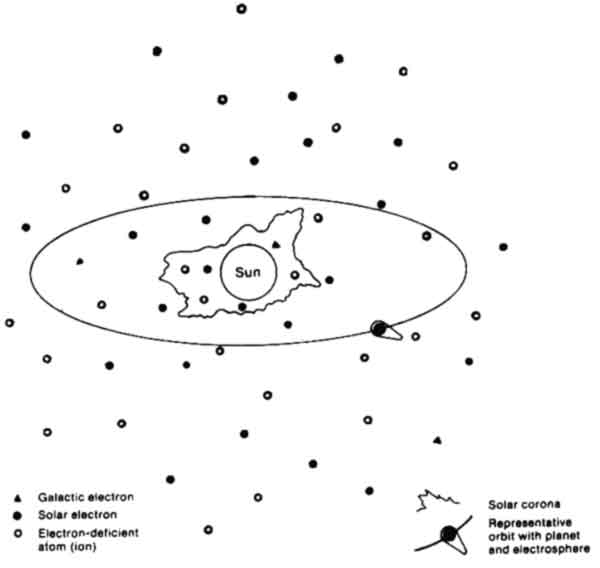 The Sun, as star, radiates energy into the space surrounding it. Stars can be conceived to have originated from electrical cavities in the structure of space. Space, to our mind, is an infinite electrical medium. It is electrical in that it is everywhere occupied by a charge, which, when it moves, assumes the character of electrons, that is, "negative" charge (see Note B). The movement energizes and carries material into the cavities which become and are the stars.