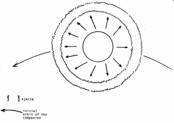 Instability of Super Uranus periodically expelled from that body a halo of debris whose nature depended upon the intensity of the particular outburst. It is conceivable that the process could persist over several millennia with frequent small eruptions occurring at intervals similar to an active volcano or to a recurrent nova (Chapter Ten). Mild outbursts might only cause ejection of superficial material gases and fine solids. Violent ejections could send massive chunks of solid material away from the star. Because the binary is nestled in the cavity, the ejecta does not escape the system. However, its fate is dependent upon its electrical state and the direction of ejection.