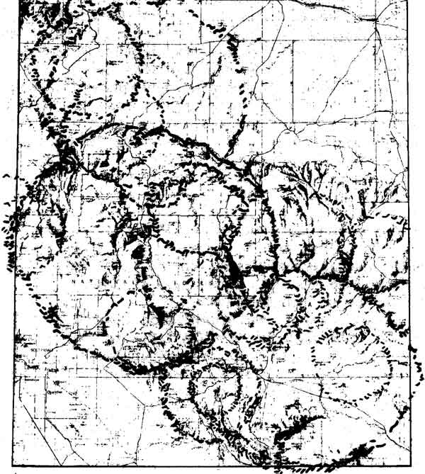 The geophysics of crater identification is in its infancy; the very idea of the Earth having suffered extraterrestrial encounters has been resisted until lately (Ninniger), Craters from smaller than seven kilometers to seven hundred times that diameter are discernable under various geological formations at widely separated locations in continental North America and elsewhere (Saul). Ancient meteorite craters may be the source of many circular features of the Earth, but few of such topographical formations have been given more than a superficial look (Norman et al., p692) Figure 24 shows an area of broken terrain in Arizona from which Saul's analysis revealed a set of overlapping and eroded astroblemes as shown drawn over the map. Notably, metal and mineral deposits are distributed among these astroblemes, lending support to our suggestion elsewhere in this book that most if not all useful minerals and metals are deposited and produced by quantavolutionary processes.